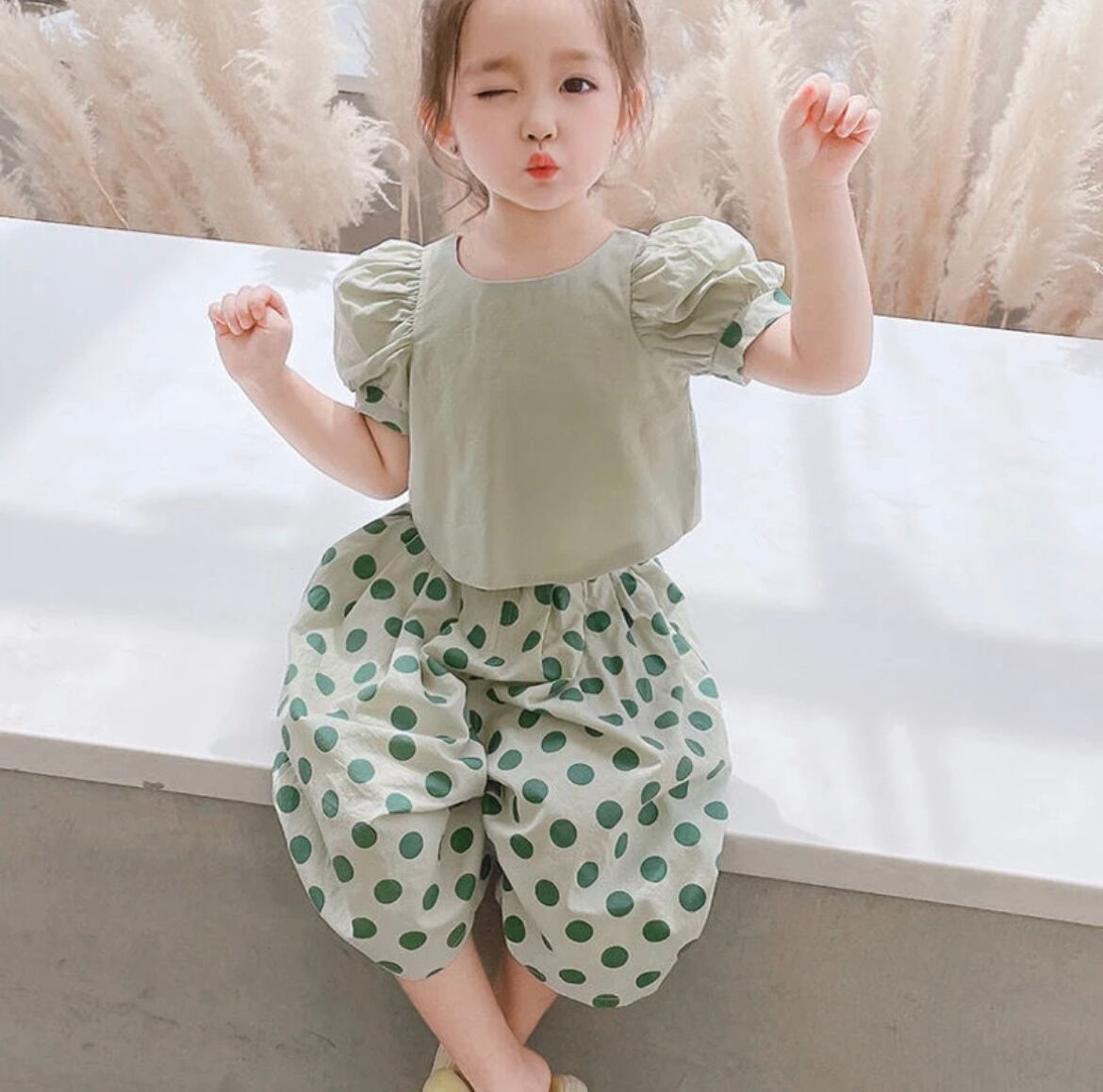 シンプルなトップスに比べ、ズボンは大きめのドット柄でとても可愛いセットアップのお洋服となっております。